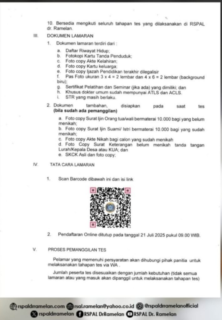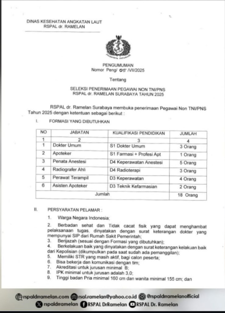 Seleksi Penerimaan Pegawai Non TNI/PNS RSPAL dr. Ramelan Surabaya 2025,